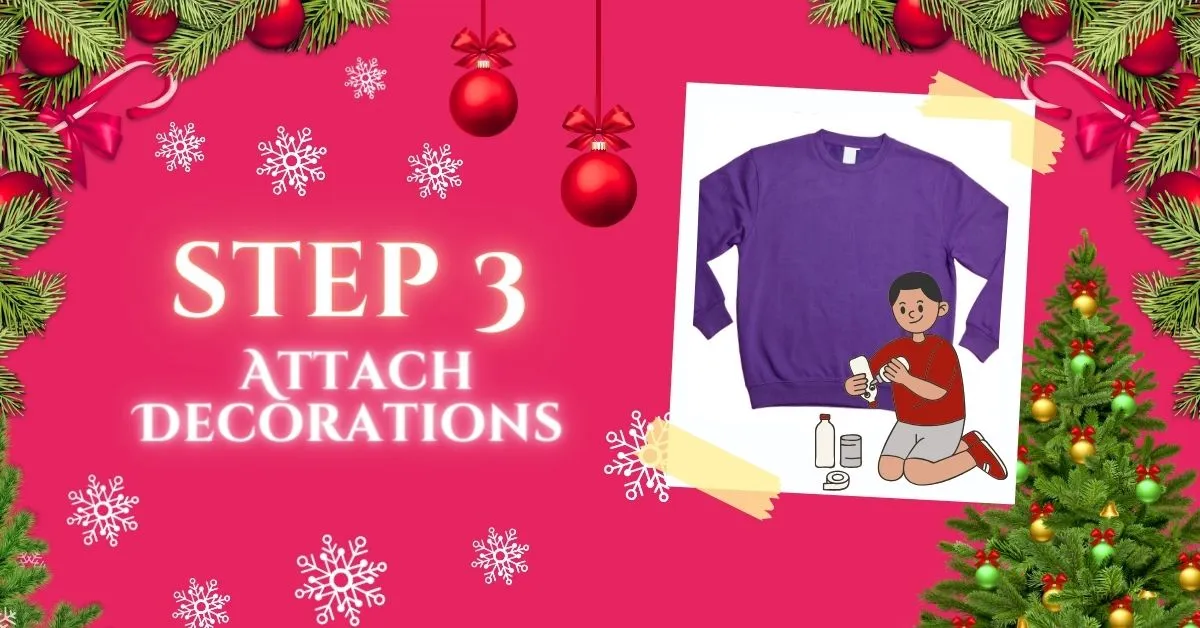 Then, gather 3D elements like miniature ornaments, tinsel, and twinkling lights to bring your sweater to life. Glue on miniature ornaments to mimic the baubles adorning a Christmas tree, and use tinsel to create the illusion of garland.