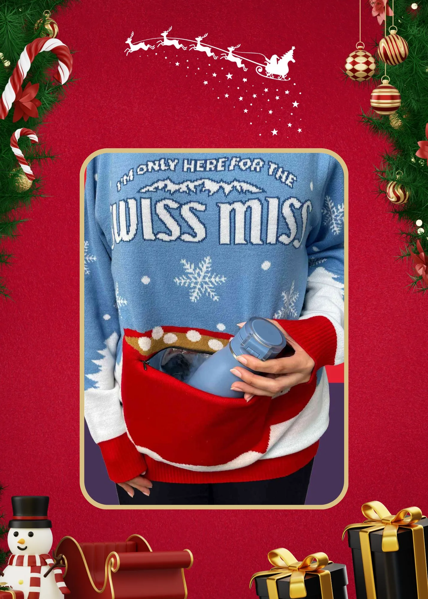 Stitch or glue a Christmas stocking onto your sweater, then fill it with small, festive surprises like candy canes or tiny ornaments.