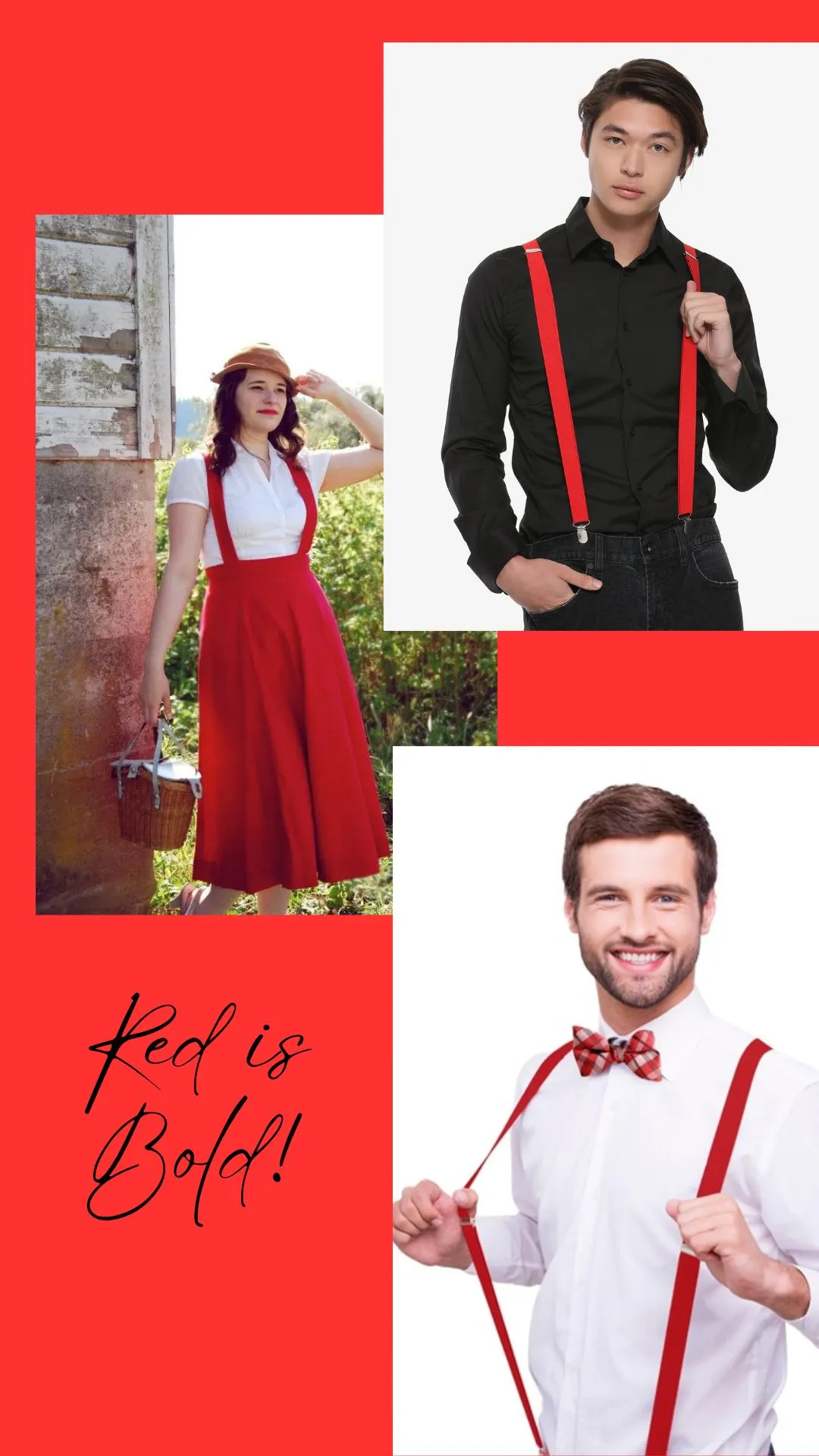 Red suspenders can be paired with neutral tones, blue denim, a nautical theme, complementary shades, festive outfits, or a vintage aesthetic, depending on the occasion and your style preference.