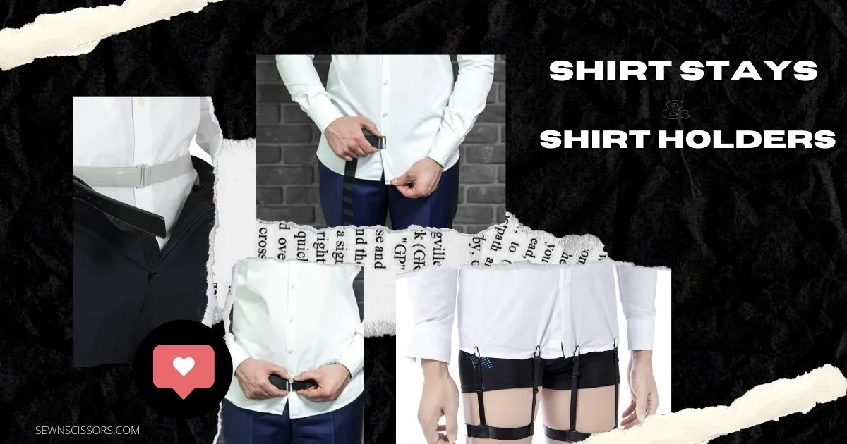 Shirt stays, also known as shirt garters or shirt holder suspenders, are elastic straps that attach to the bottom of a dress shirt and then clip onto the socks or lower part of the leg to keep the shirt tucked in and prevent it from bunching up or coming untucked throughout the day.